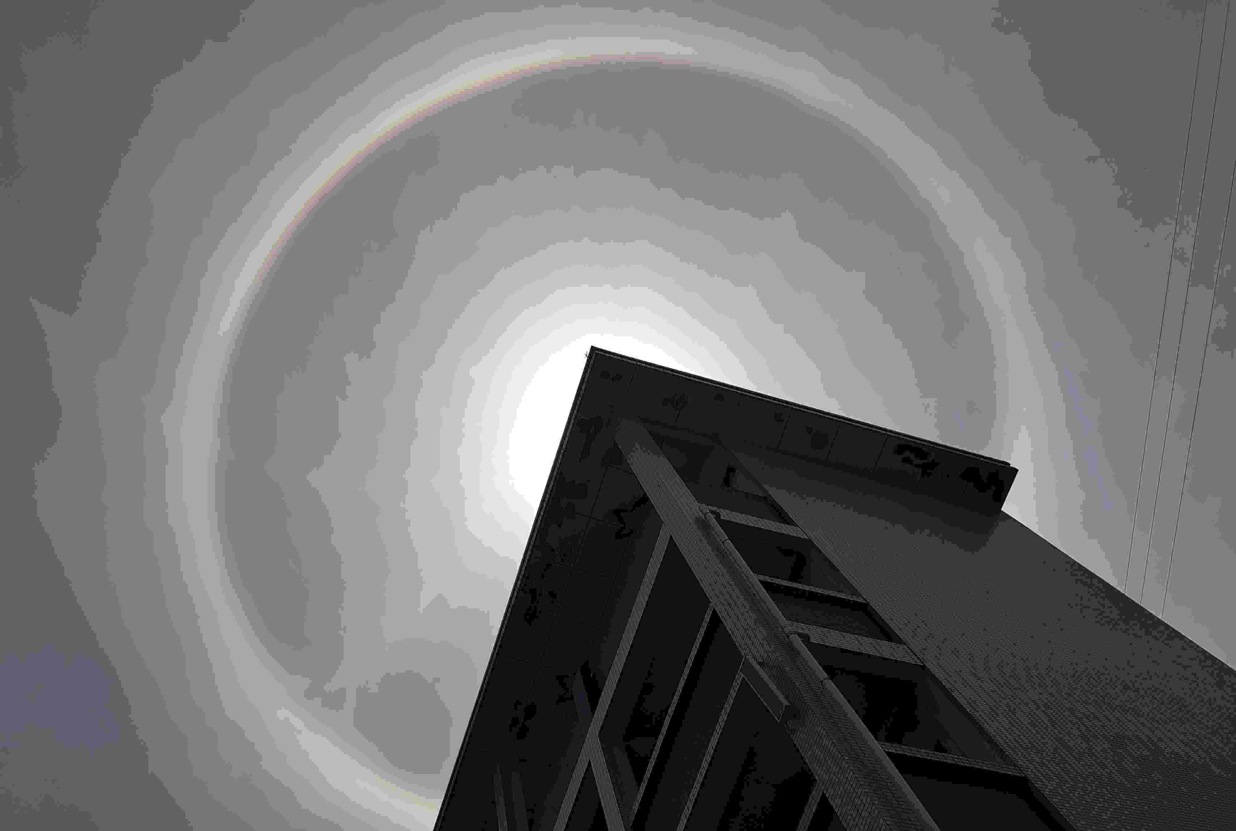 2023年5月15日中午,湖北宜昌,天空出現(xiàn)日暈景觀。當(dāng)日,多地天空出現(xiàn)日暈。日暈是一種大氣光學(xué)現(xiàn)象,是太陽(yáng)光通過云層中的冰晶折射或反射而形成的。 視覺中國(guó)