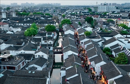 游客在江蘇蘇州山塘街休閑游玩(2023 年 4 月 10 日攝) 李博攝 / 本刊