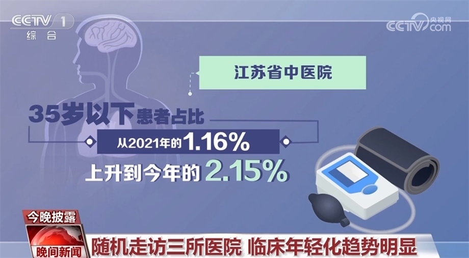 總臺記者隨機(jī)走訪了北京、江蘇、河南三所醫(yī)院的高血壓門診發(fā)現(xiàn):河南省洛陽市第一人民醫(yī)院,2022年接診的3000多名患者中,低于30歲的有21人;江蘇省中醫(yī)院,35歲以下患者占比從2021年的1.16%,上升到今年的2.15%;北京安貞醫(yī)院的數(shù)據(jù)則顯示,70%的門診患者為中青年群體。