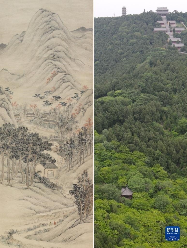 這是一張拼版照片,左圖為:《八公秋霽圖》,由清代畫家潘思牧創(chuàng)作,現(xiàn)收藏于安徽博物院(新華社發(fā),李鵬飛 攝);右圖為:5月16日拍攝的位于安徽省淮南市壽縣的八公山風(fēng)景區(qū)(無人機照片,新華社記者張端攝)。   新華社發(fā)
