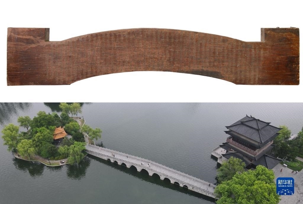 這是一張拼版照片,上圖為:《逍遙津木刻枋》,現(xiàn)收藏于安徽博物院(新華社發(fā),吳艷攝);下圖為:5月17日拍攝的位于安徽省合肥市的逍遙津公園(無人機照片,新華社記者張端攝)。   新華社發(fā)