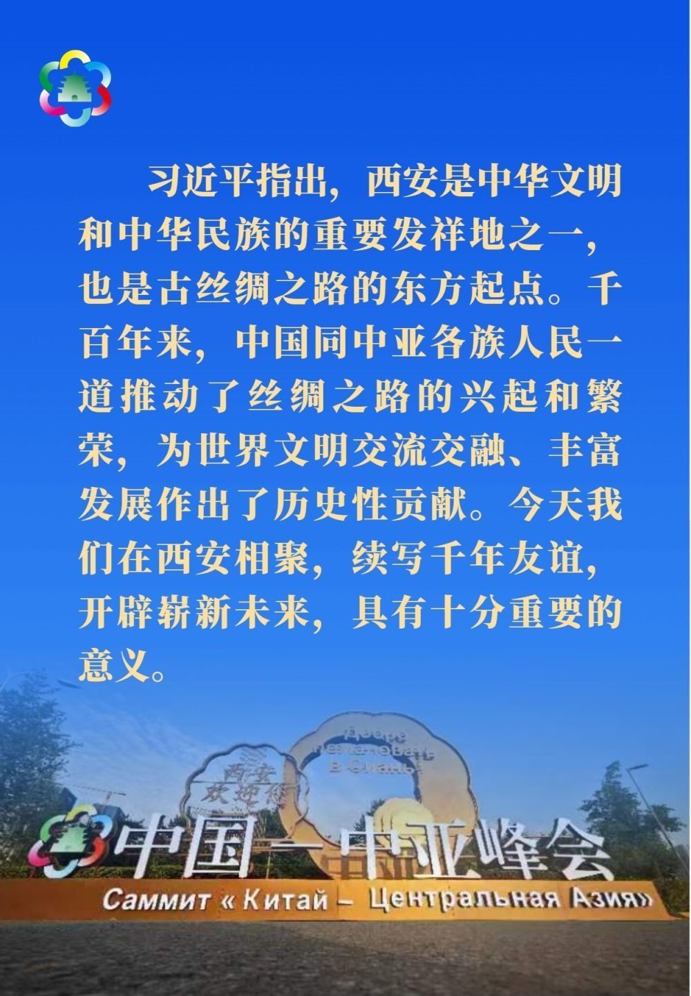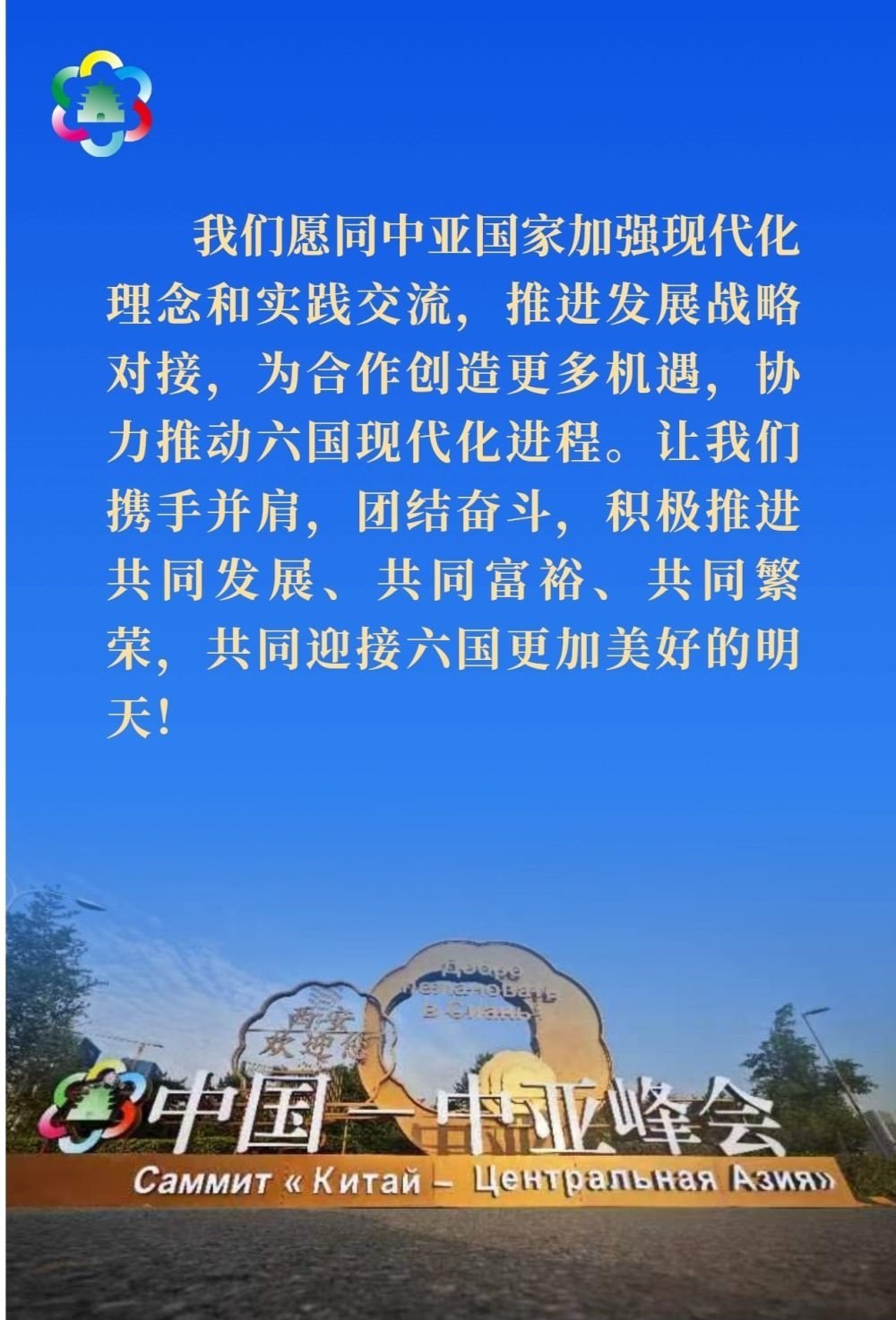 習(xí)近平發(fā)表題為《攜手建設(shè)守望相助、共同發(fā)展、普遍安全、世代友好的中國-中亞命運(yùn)共同體》的主旨講話。