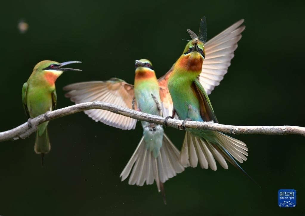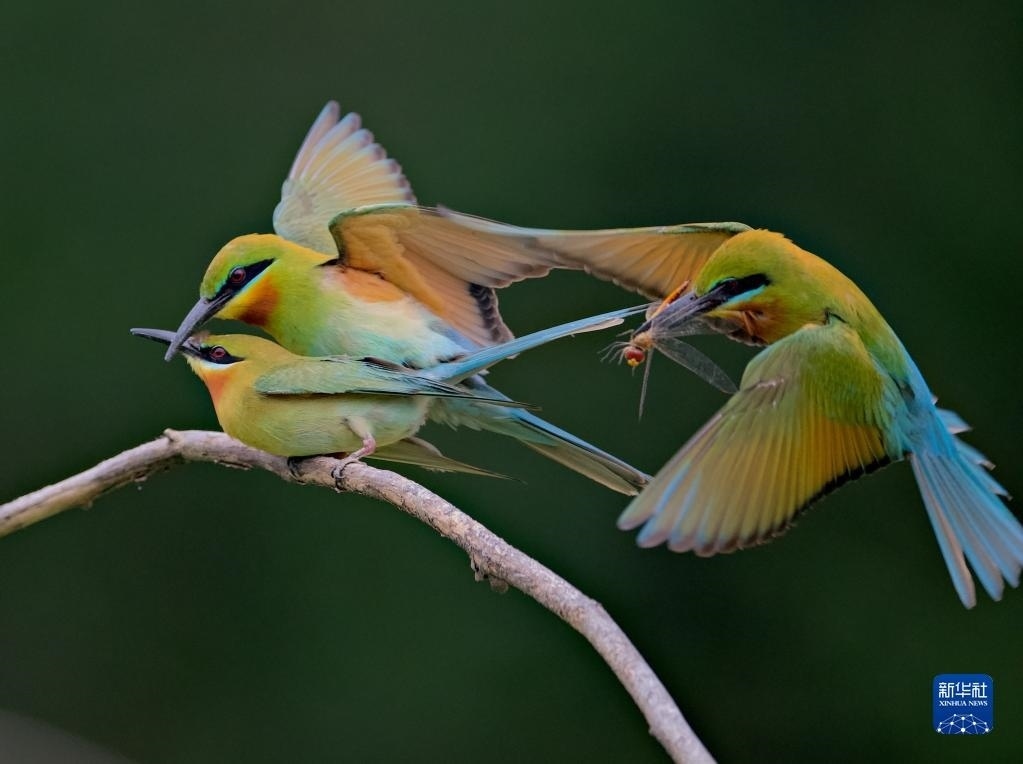 5月20日,兩只栗喉蜂虎在樹(shù)枝上玩耍。