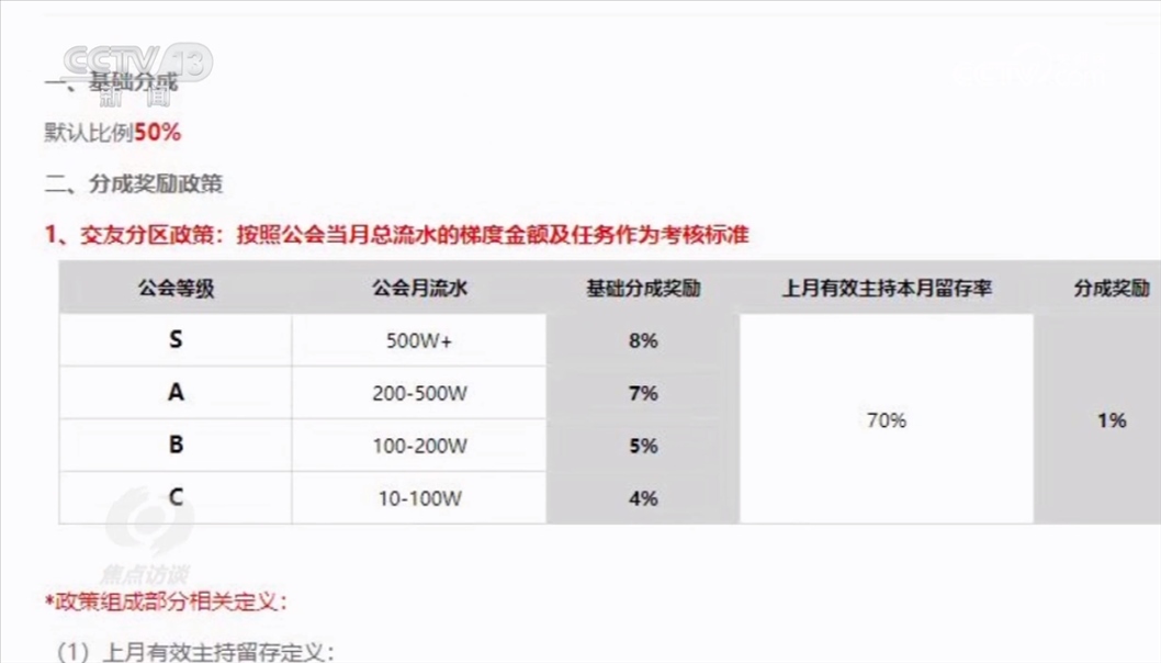 主播得到的打賞,平臺和經(jīng)紀(jì)機(jī)構(gòu)都會參與分成。一般來說,平臺要首先分走50%的打賞費用,剩下的由主播和經(jīng)紀(jì)機(jī)構(gòu)來分。從某平臺與主播經(jīng)紀(jì)公司的后臺約定中可以看出,當(dāng)月總流水的梯度金額及任務(wù)作為考核。經(jīng)紀(jì)機(jī)構(gòu)月流水超過500萬元,至少可以額外拿到8%的獎勵。在這種制度的激勵下,就推動經(jīng)紀(jì)公司和主播想方設(shè)法爭取更高額度的打賞。