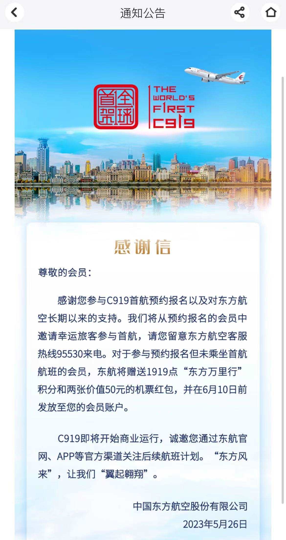 東航APP上還發(fā)布了一則感謝信,信中表示,C919即將開始商業(yè)運(yùn)行,東航將從預(yù)約報名的會員中邀請幸運(yùn)旅客參與首航,對于參與預(yù)約報名但未乘坐首航航班的會員,東航將贈送1919點(diǎn)“東方萬里行”積分和兩張價值50元的機(jī)票紅包,并在6月10日前發(fā)放至?xí)T賬戶。