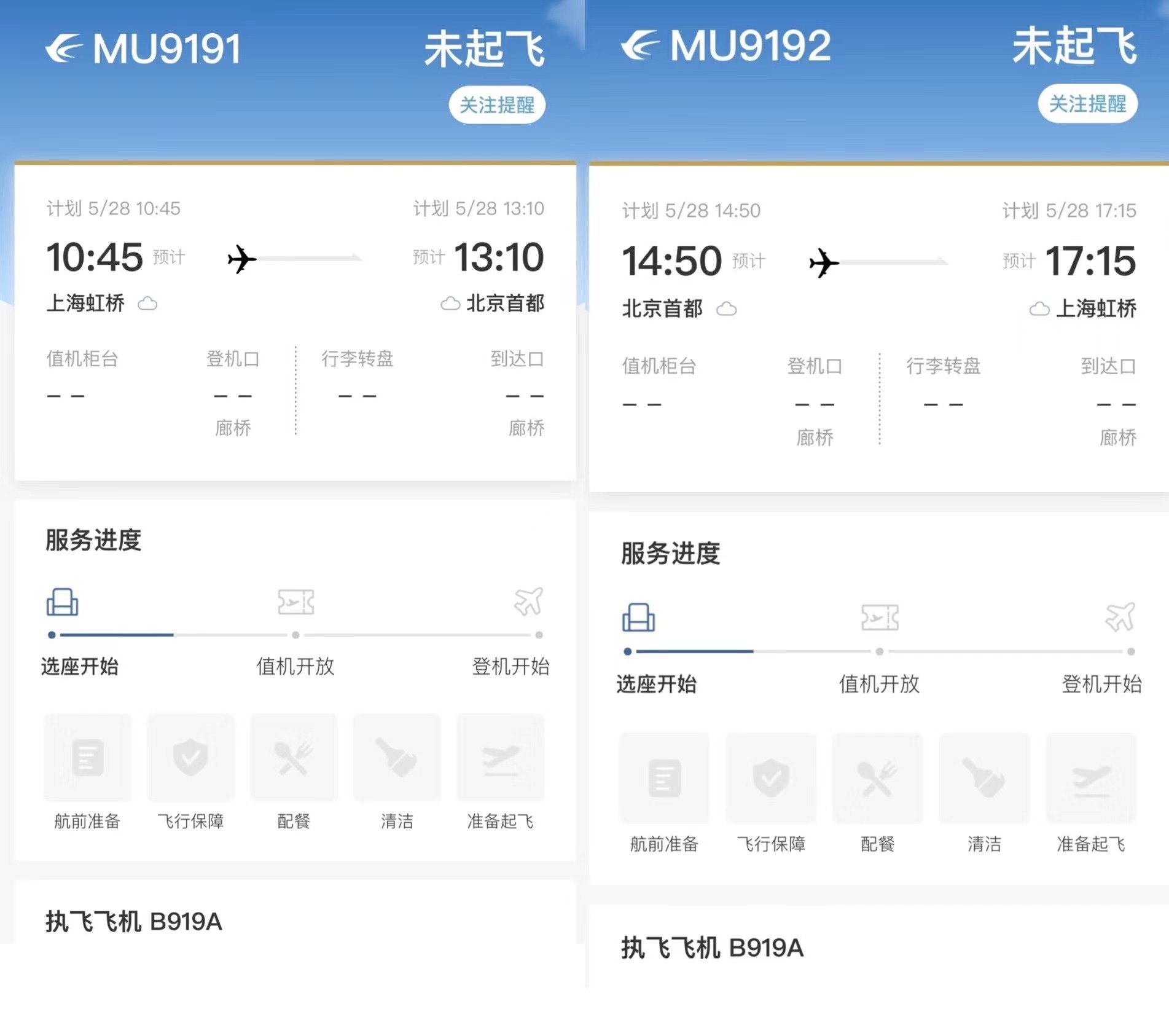 此外,5月26日稍早些,澎湃新聞記者在東航APP上查詢發(fā)現(xiàn),東航C919首個商業(yè)航班飛行計劃公布,班次為5月28日MU9191上海虹橋-北京首都,MU9192北京首都-上海虹橋,計劃飛行時長2小時25分鐘。