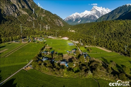 2023年5月24日,西藏林芝,波密縣松宗鎮(zhèn)龍亞村,民居、樹木和遠(yuǎn)處的雪山相映成趣。