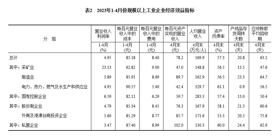 4月末,規(guī)模以上工業(yè)企業(yè)每百元資產(chǎn)實現(xiàn)的營業(yè)收入為78.2元,同比減少5.6元;人均營業(yè)收入為169.9萬元,同比增加6.2萬元;產(chǎn)成品存貨周轉(zhuǎn)天數(shù)為20.8天,同比增加1.3天;應(yīng)收賬款平均回收期為63.1天,同比增加6.4天。