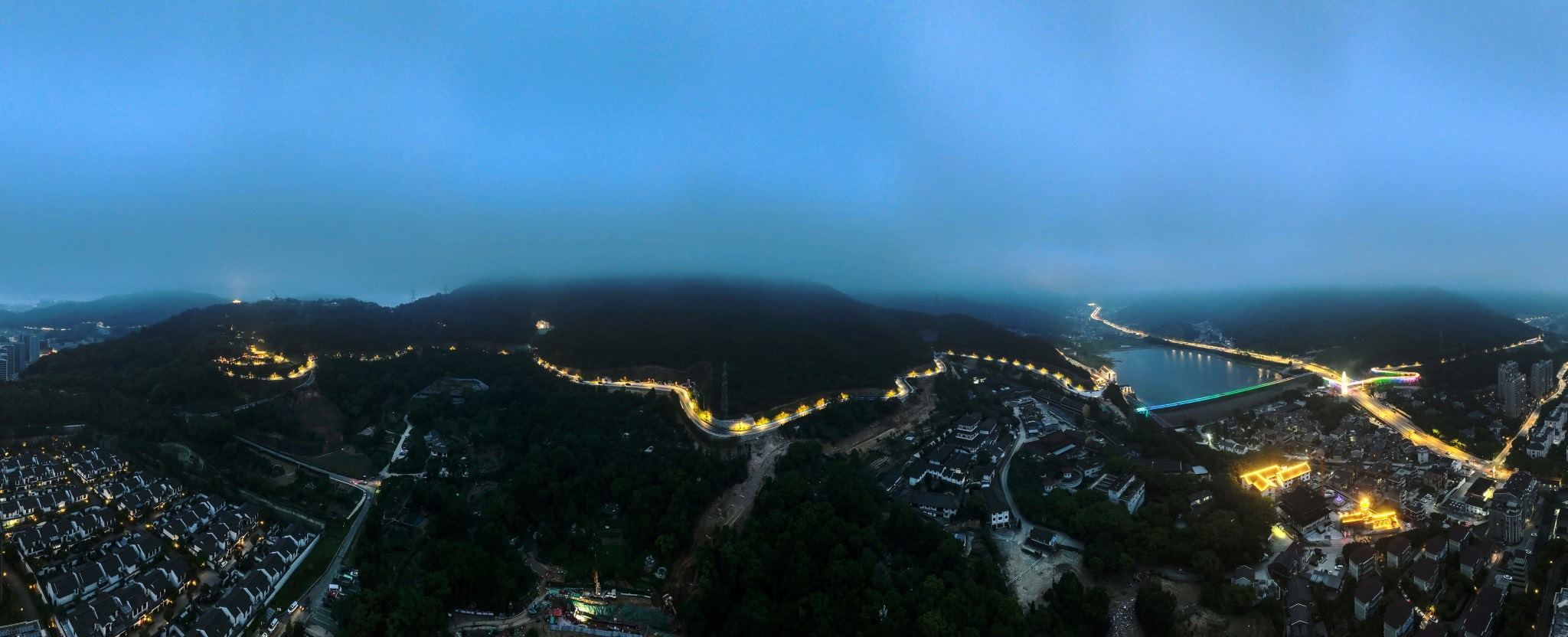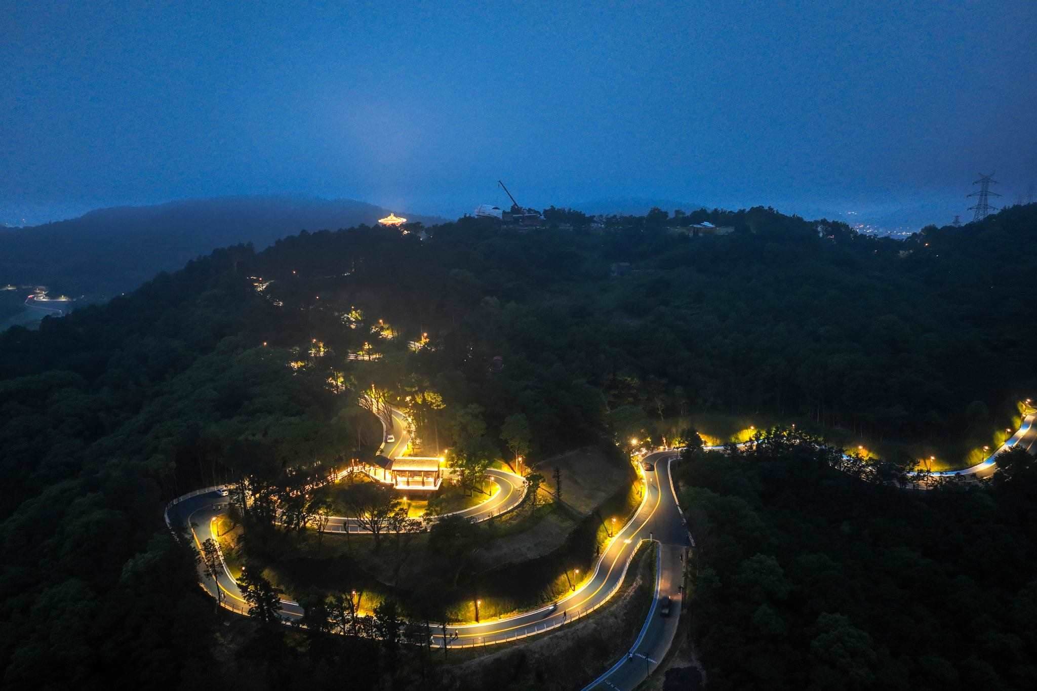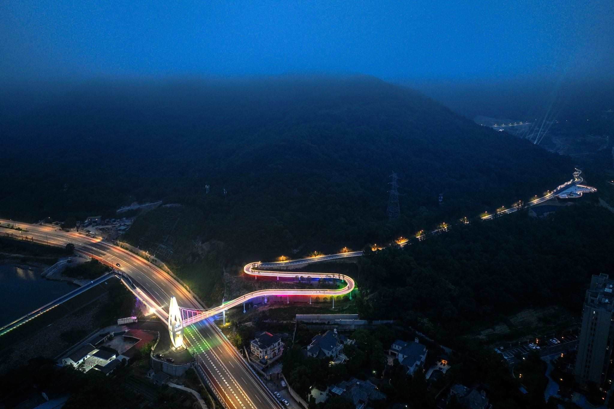 2023年5月26日,浙江舟山,定海區(qū)東海云廊的便道燈準時亮起,使這條青山疊翠、美麗磅礴的東海云廊更為靚麗,似蛟龍遨游在蒼翠間。