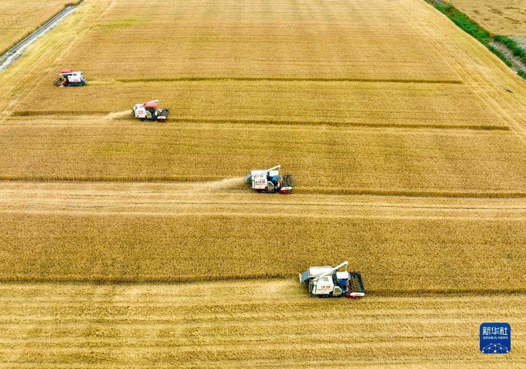 近日,江蘇省泰州市255萬畝小麥陸續(xù)進入收割期,當?shù)剞r(nóng)民搶抓晴好天氣加緊收割。農(nóng)機在田間穿梭,構(gòu)成了一幅美麗的豐收圖畫。
