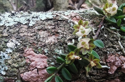 蘭科新物種——臥龍無柱蘭,于2021年11月發(fā)表于國際植物學(xué)期刊《北歐植物學(xué)》,是程躍紅和林紅強(qiáng)等人在轄區(qū)巡護(hù)監(jiān)測過程中發(fā)現(xiàn)的,以模式產(chǎn)地“臥龍”命名。該蘭科植物生長在海拔2700米左右的陡峭崖壁上,植株高約19-22厘米,花期7-8月,莖為呈紫紅色,開白色小花,中心為綠色,目前僅在大熊貓國家公園臥龍片區(qū)發(fā)現(xiàn)1個居群,約70株成熟個體,參照IUCN(世界自然保護(hù)聯(lián)盟)的標(biāo)準(zhǔn),臥龍無柱蘭被認(rèn)定為“極度瀕?!钡燃壍闹参?。