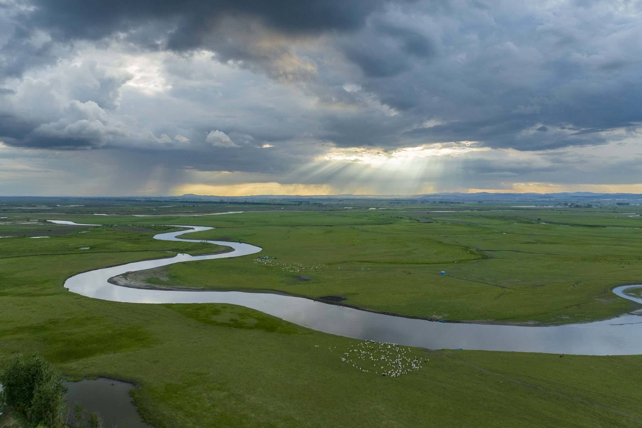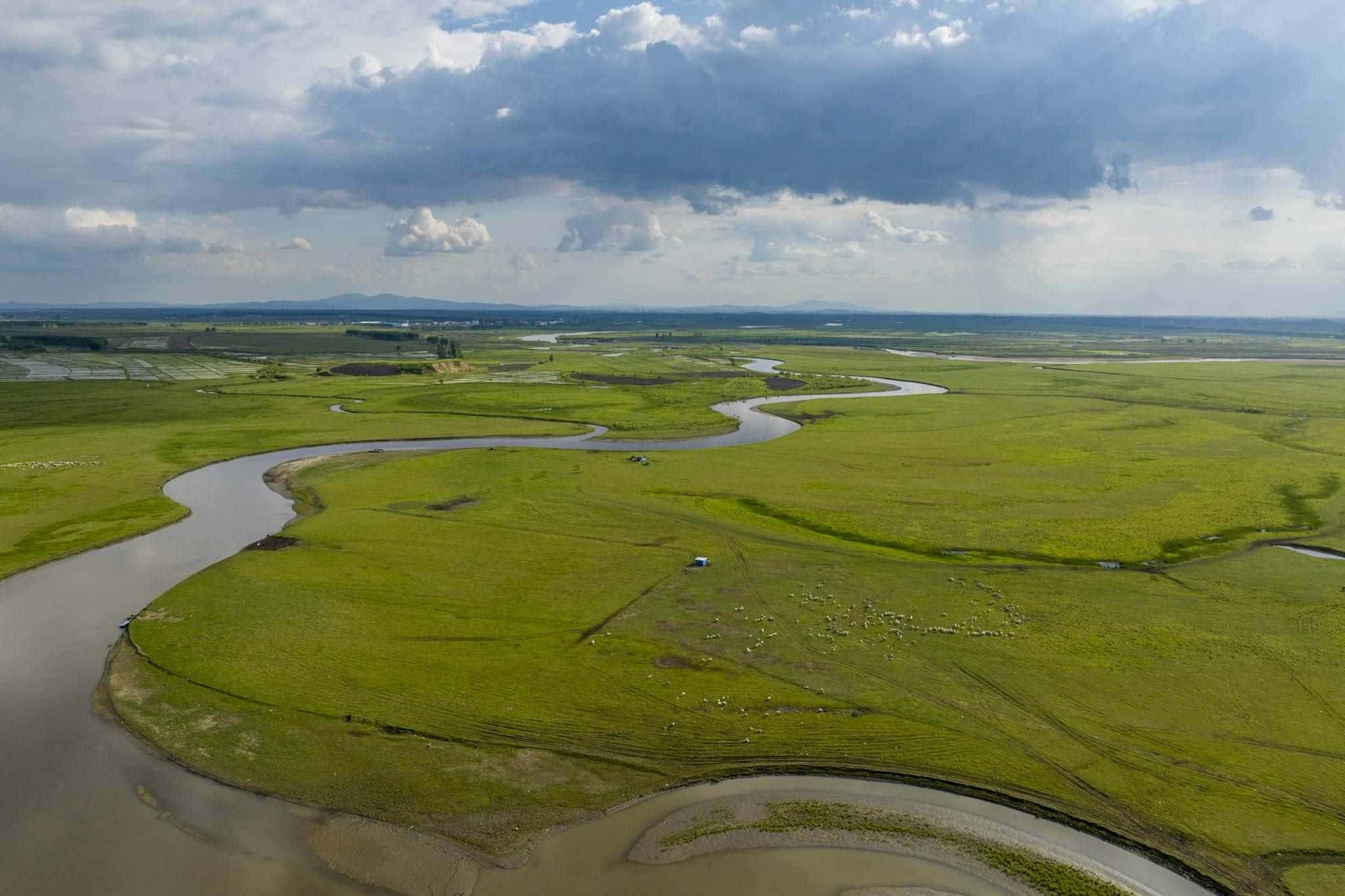 2023年6月2日傍晚,黑龍江雞西,在密山境內(nèi)的穆棱河流域上空云景變幻,河套草原景色秀美。視覺中國(guó)