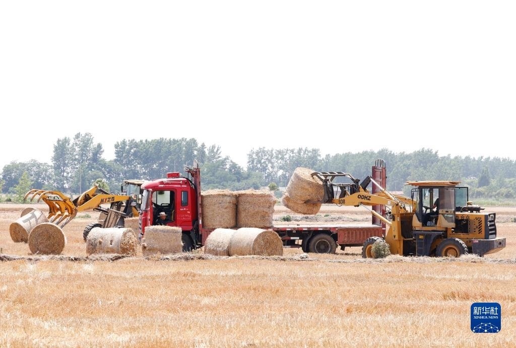 6月3日,在泗洪縣龍集鎮(zhèn)勒東村,農(nóng)機手將打捆好的秸稈運輸離田。   新華社發(fā)(許昌亮 攝)