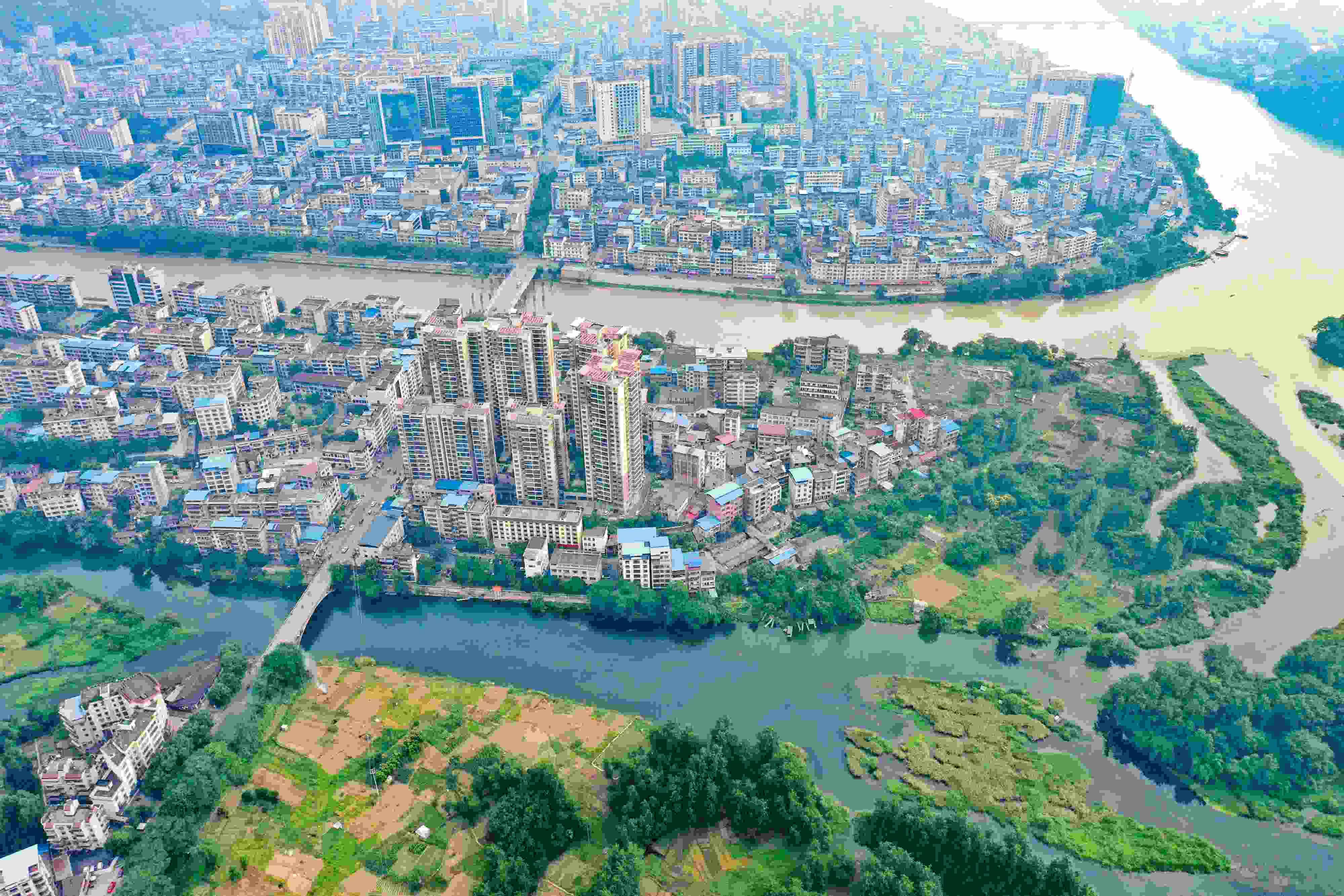 2023年6月4日,受降雨影響,廣西桂林全州縣城湘江河段出現(xiàn)涇渭分明景觀??罩懈╊?,湘江支流萬鄉(xiāng)河混濁的河水繞城匯入清澈的湘江干流,交匯之處涇渭分明。 視覺中國