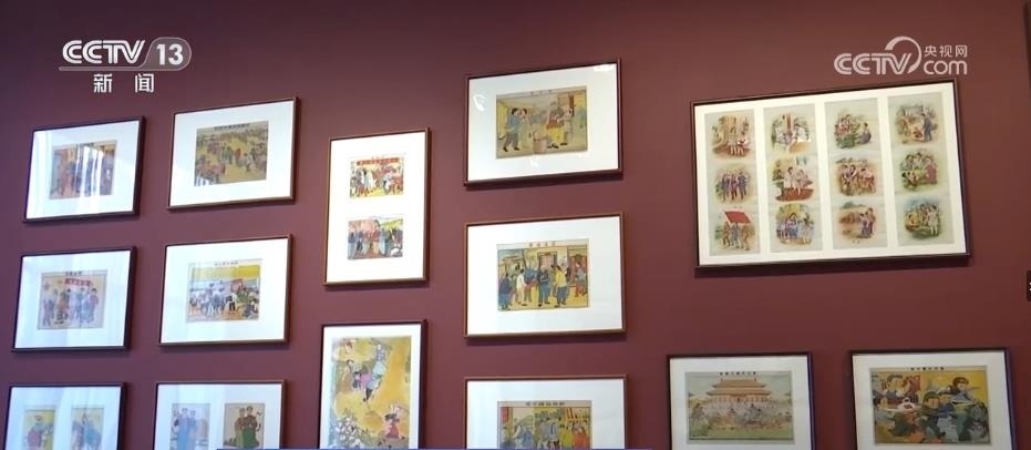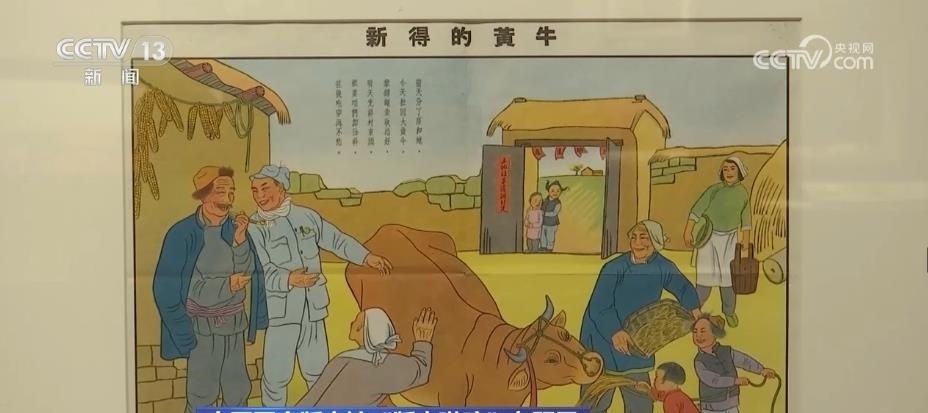 跟隨著講解員,再往前走,國家版本館的特色館藏——年畫、連環(huán)畫和宣傳畫出現(xiàn)在眼前。這面墻上和展柜集中展出了47幅新中國成立初期的新年畫。畫家李可染在1950年創(chuàng)作的《新得的黃牛》等作品,展現(xiàn)出老百姓感受到新中國新生活的幸福和美好。