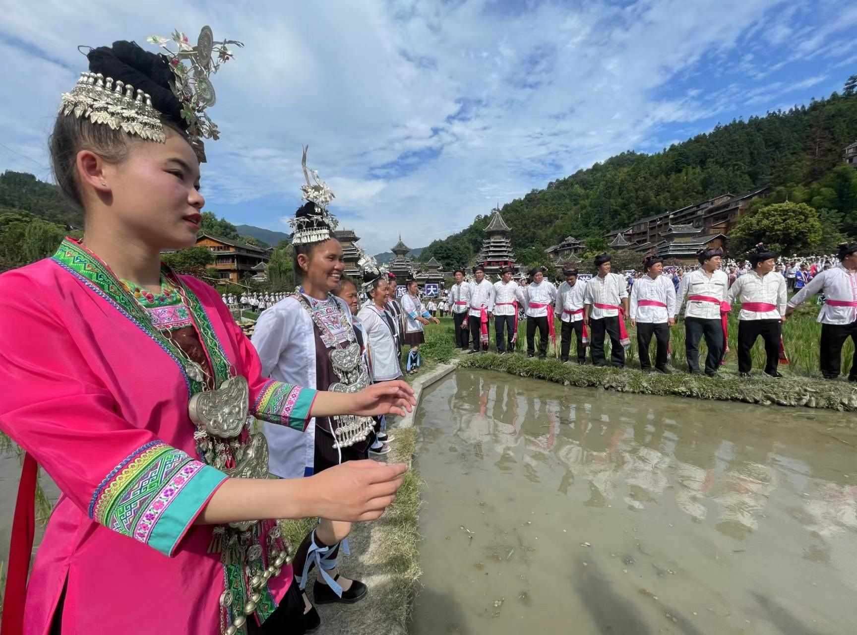 2023年6月10日,侗族同胞在貴州省黎平縣肇興侗寨田園實景展示侗族大歌。