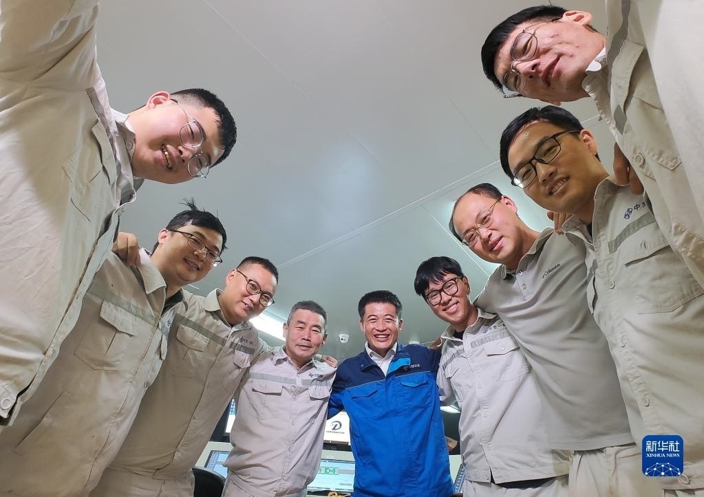 6月11日,在深中通道海底隧道管節(jié)最終接頭合龍后,中交一航局深中項目測管中心負責人鎖旭宏(中)和團隊成員一起慶賀。   新華社發(fā)