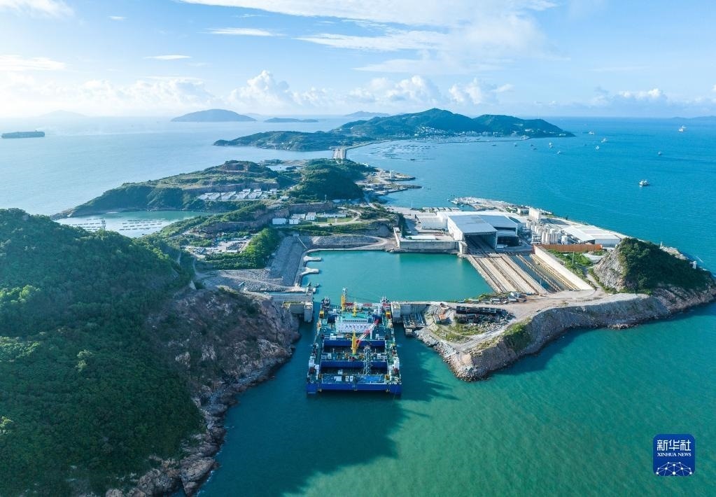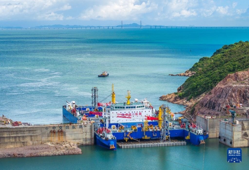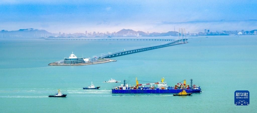 “一航津安1”號沉管運輸安裝一體船拖帶E23管節(jié)和最終接頭從珠海桂山島啟航,前往沉放水域(6月8日攝,無人機照片)。   新華社發(fā)
