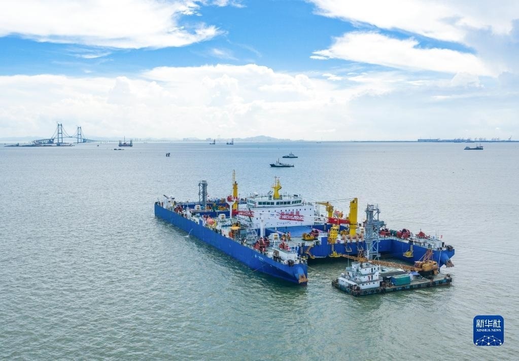 “一航津安1”號沉管運輸安裝一體船在沉放安裝E23管節(jié)和最終接頭,背后是建設(shè)中的深中通道伶仃洋大橋(6月9日攝,無人機照片)。   新華社發(fā)