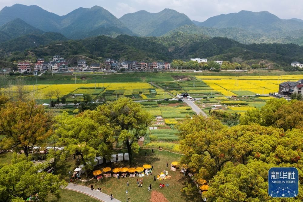 空中俯瞰浙江杭州市富陽區(qū)新桐鄉(xiāng)小桐洲村香樟公園和盛開的油菜花田(4月7日攝,無人機(jī)照片)。新桐鄉(xiāng)依托近萬畝盛開的油菜花田和美麗的富春江風(fēng)景,開展特色鄉(xiāng)村文旅活動,做好美麗鄉(xiāng)村、美麗經(jīng)濟(jì)的文章,助力鄉(xiāng)村振興。新華社記者 徐昱 攝