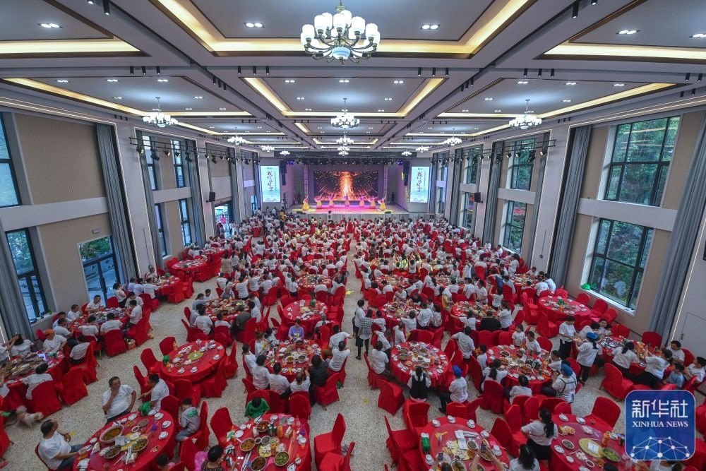 浙江建德市新安江街道梅坪村村民在村文化禮堂內(nèi)參加百家宴并觀看文藝演出(5月27日攝)。新華社記者 徐昱 攝
