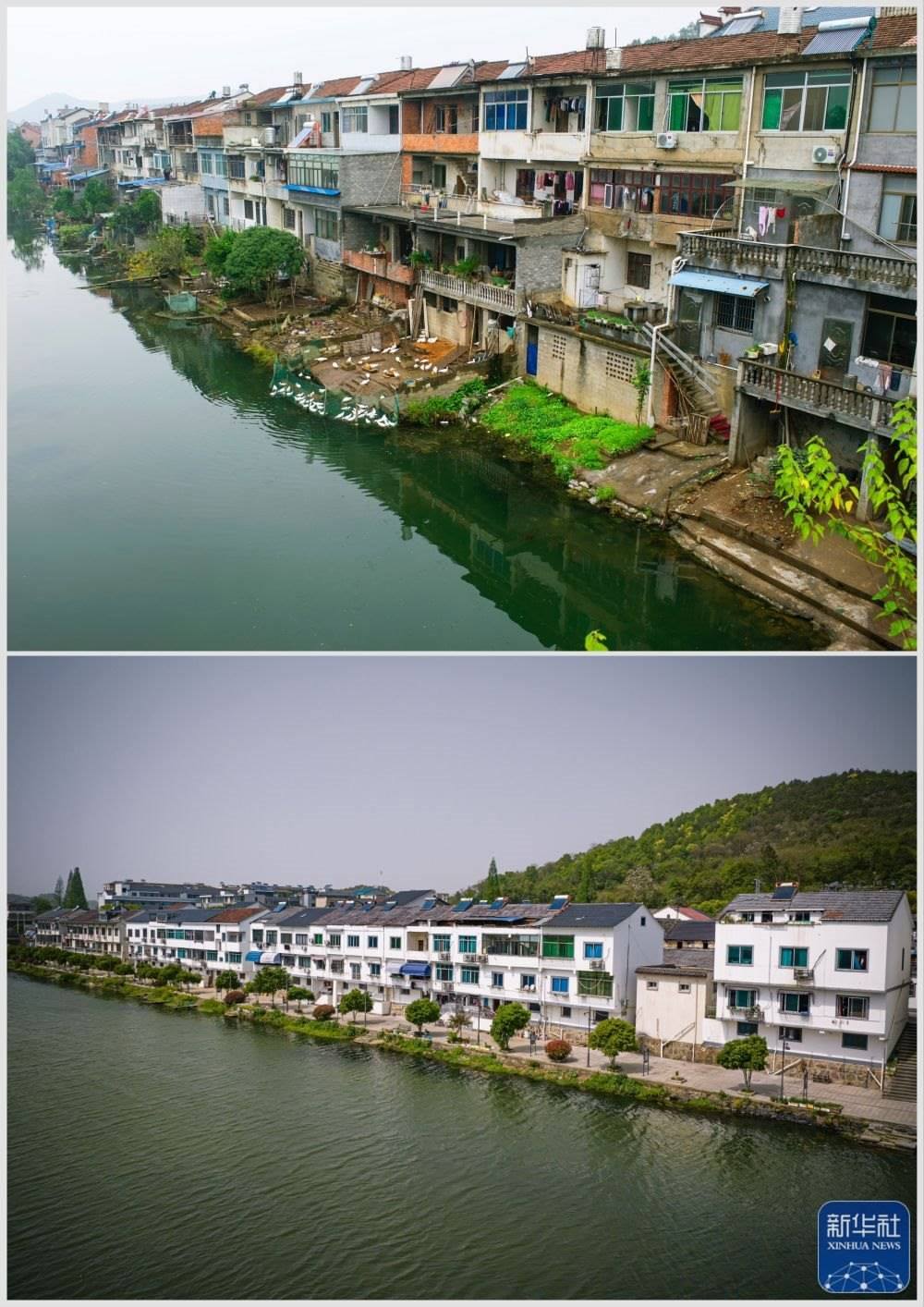拼版照片:上圖為浙江諸暨市暨南街道街亭村開化江畔的民居(2013年11月13日攝);下圖為村容村貌提升后暨南街道街亭村開化江畔民居新貌(無人機(jī)照片,2023年4月12日攝)。新華社記者 江漢 攝