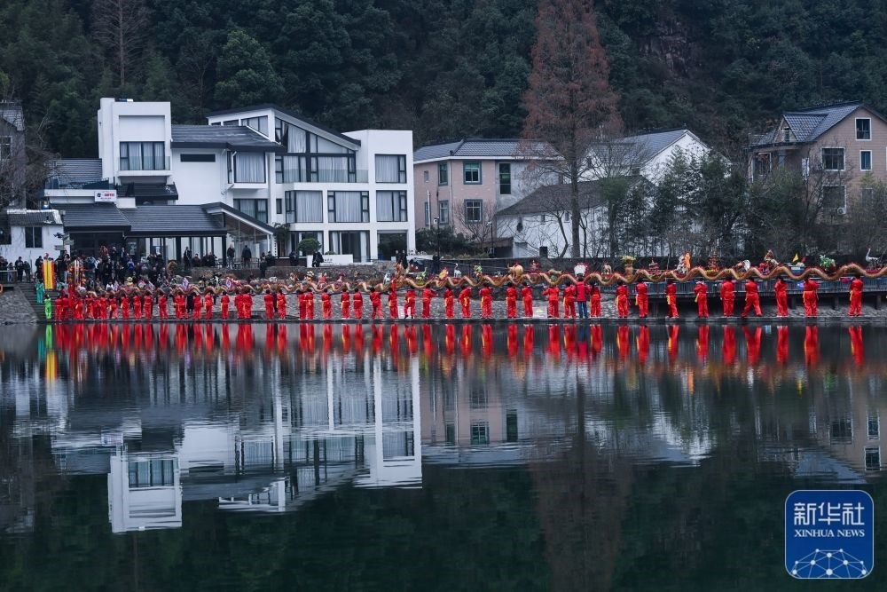 浙江杭州市富陽區(qū)湖源鄉(xiāng)窈口村女子板龍隊在進(jìn)行板凳龍舞龍表演(2月1日攝)。湖源鄉(xiāng)是個群山環(huán)抱、青山綠水、生態(tài)秀美的山區(qū)鄉(xiāng)鎮(zhèn),近年來,湖源緊抓機(jī)遇,圍繞“樂水湖源、龍鱗+”發(fā)展目標(biāo),立足山水特色,錨定發(fā)展綠色經(jīng)濟(jì),打造獨(dú)具特色的鄉(xiāng)村旅游品牌。新華社記者 徐昱 攝