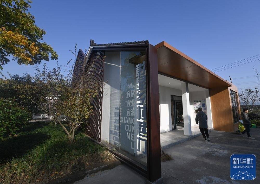 這是浙江杭州市桐廬縣桐君街道梅蓉村金黃的稻田與鄉(xiāng)村會客廳(2022年10月25日攝)。新華社記者 江漢 攝