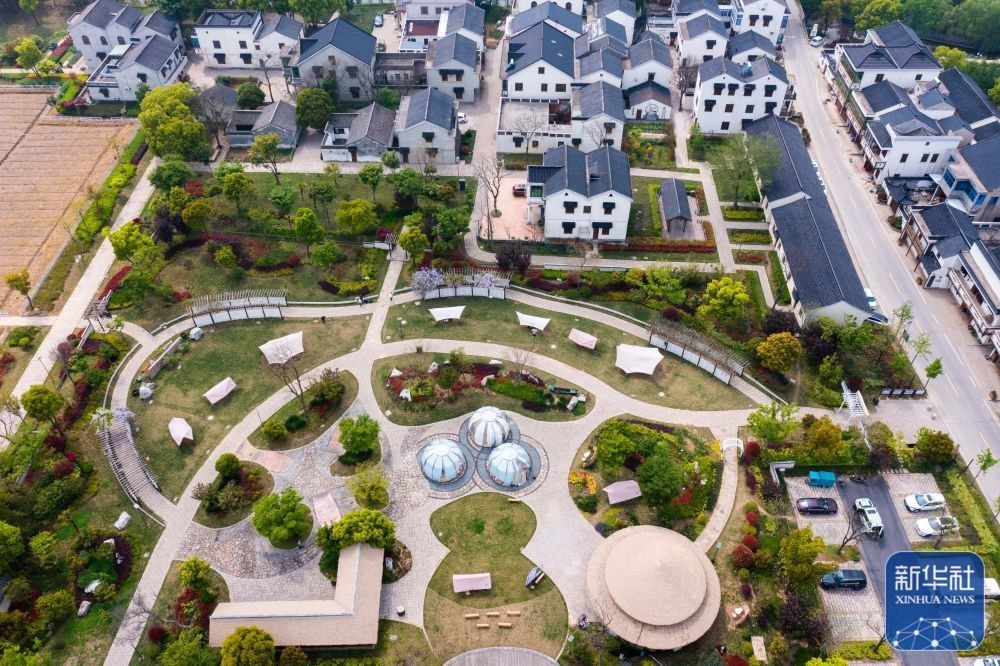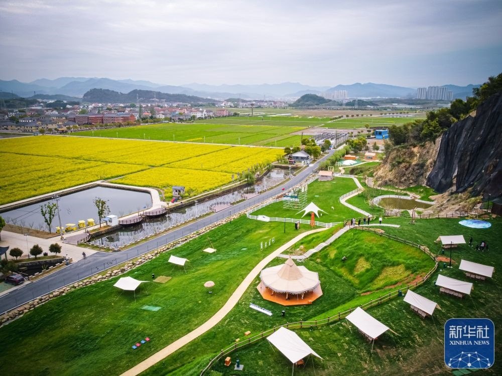4月11日拍攝的浙江湖州市吳興區(qū)織里鎮(zhèn)伍浦村漁耕文化園的陶灣里鄉(xiāng)村咖啡店以及鄉(xiāng)村露營地(無人機(jī)照片)。近年來,湖州市吳興區(qū)織里鎮(zhèn)依托當(dāng)?shù)孛利愢l(xiāng)村建設(shè)以及自然風(fēng)光,招引鄉(xiāng)賢返鄉(xiāng)創(chuàng)業(yè),用閑置民宅、閑置土地建設(shè)特色咖啡店、花海景觀、特色民宿和農(nóng)家樂等,做足鄉(xiāng)村旅游經(jīng)濟(jì)功課。新華社記者 徐昱 攝