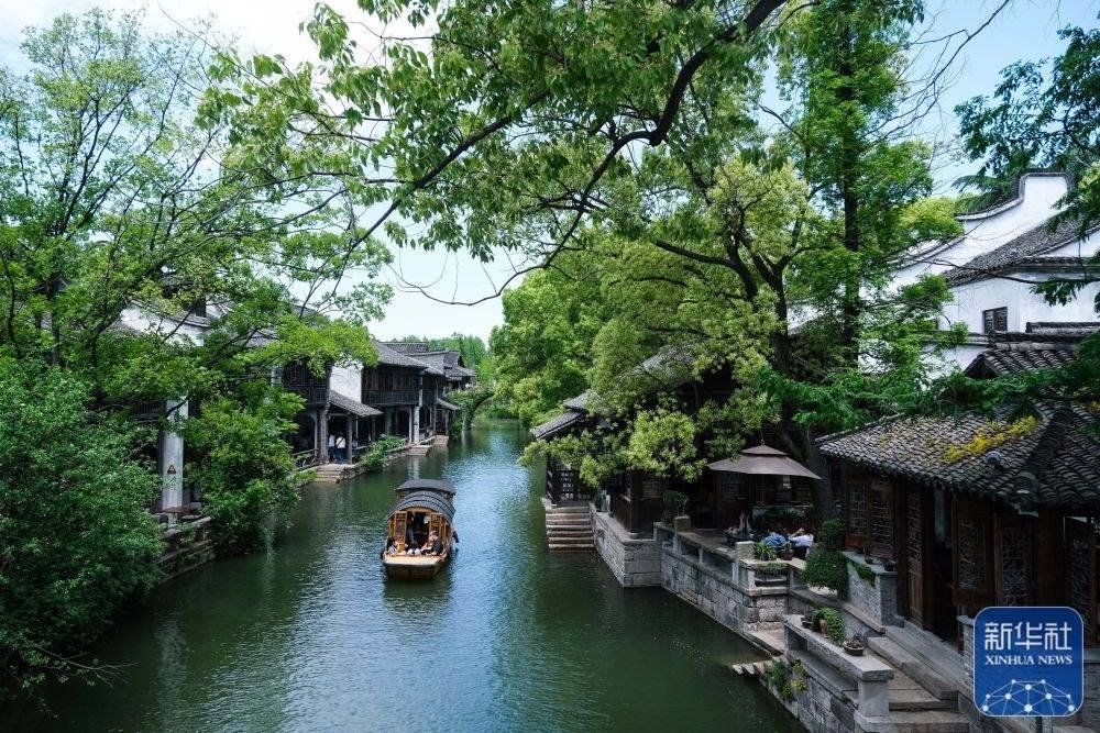 游客乘船在浙江嘉興桐鄉(xiāng)市濮院鎮(zhèn)的濮院時尚古鎮(zhèn)游覽(5月2日攝)。濮院時尚古鎮(zhèn)以“歷史街區(qū)再利用”的概念經(jīng)過10年的升級改造而成,擁有典型的江南水鄉(xiāng)地貌特征,成功創(chuàng)建為浙江省級5A級景區(qū)鎮(zhèn)。新華社記者 徐昱 攝