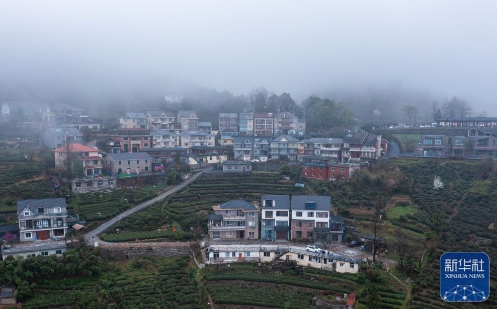 空中俯瞰云霧中的浙江杭州富陽里山鎮(zhèn)安頂村(3月23日攝,無人機(jī)照片)。安頂村海拔700多米,一年中有200多天可觀賞“安頂云?!逼婢?,當(dāng)?shù)匕傩找劳懈呱皆旗F茶以及特色鄉(xiāng)村旅游產(chǎn)業(yè),走出了一條茶旅融合的新農(nóng)村共同富裕發(fā)展模式。新華社記者 徐昱 攝