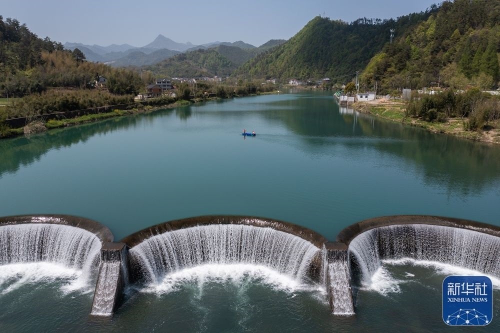 浙江杭州市臨安區(qū)昌化鎮(zhèn)黨員巡河護(hù)水志愿者乘船對昌化溪進(jìn)行日常河道保潔及巡查(2022年4月7日攝)。新華社記者 徐昱 攝