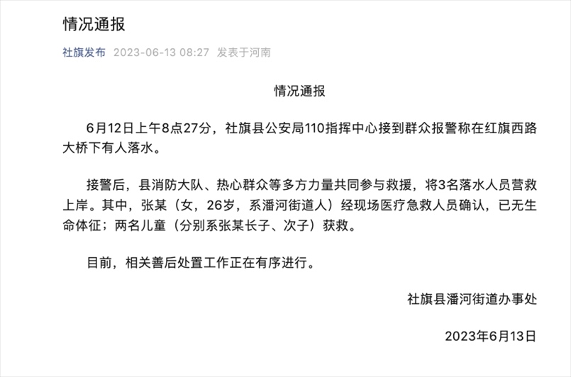 ·網(wǎng)傳南陽26歲媽媽帶2幼兒跳河,官方通報:女子已離世,兩名兒童獲救。