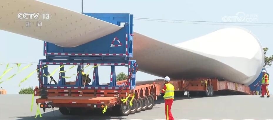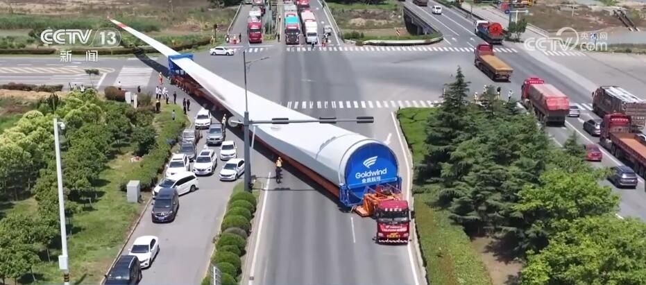 央視網(wǎng)消息:今天(6月14日)上午,100%我國(guó)自主知識(shí)產(chǎn)權(quán)的123米超長(zhǎng)海上風(fēng)電葉片在江蘇連云港啟動(dòng)陸地轉(zhuǎn)運(yùn)工作。上午9時(shí),代表著我國(guó)風(fēng)電裝備最新技術(shù)水準(zhǔn)的大葉片,從廠區(qū)到港口碼頭,陸地運(yùn)輸全程約30公里,耗時(shí)約3到4個(gè)小時(shí),其中運(yùn)輸大葉片的車(chē)輛還要拐過(guò)90度的直角彎。如此大體量的裝備運(yùn)輸是一個(gè)復(fù)雜的過(guò)程,其中有哪些技術(shù)難點(diǎn)?來(lái)看記者今天上午從現(xiàn)場(chǎng)發(fā)回的報(bào)道。