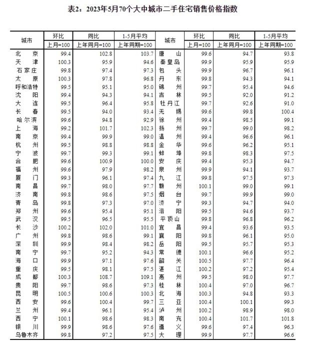 2023年5月70個大中城市二手住宅銷售價(jià)格指數(shù)。 截圖自國家統(tǒng)計(jì)局官網(wǎng)
