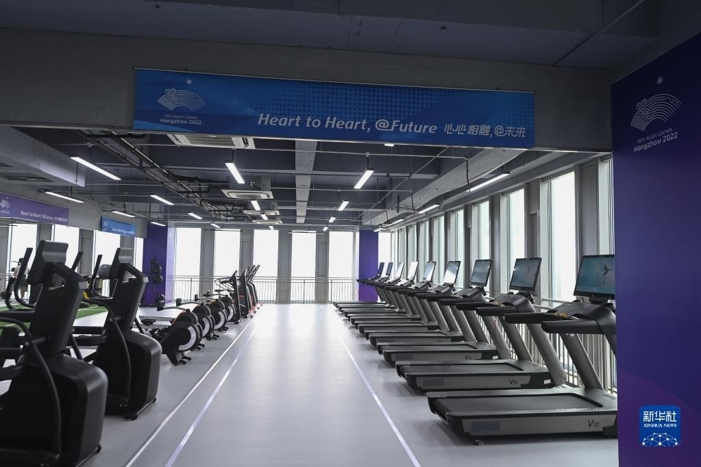 這是6月16日拍攝的杭州亞運村健身中心內(nèi)景。健身中心設(shè)置有氧運動區(qū)、爆發(fā)力訓練區(qū)、拉伸恢復區(qū)、綜合器械區(qū)及功能性訓練區(qū),可容納約350名運動員同時使用。