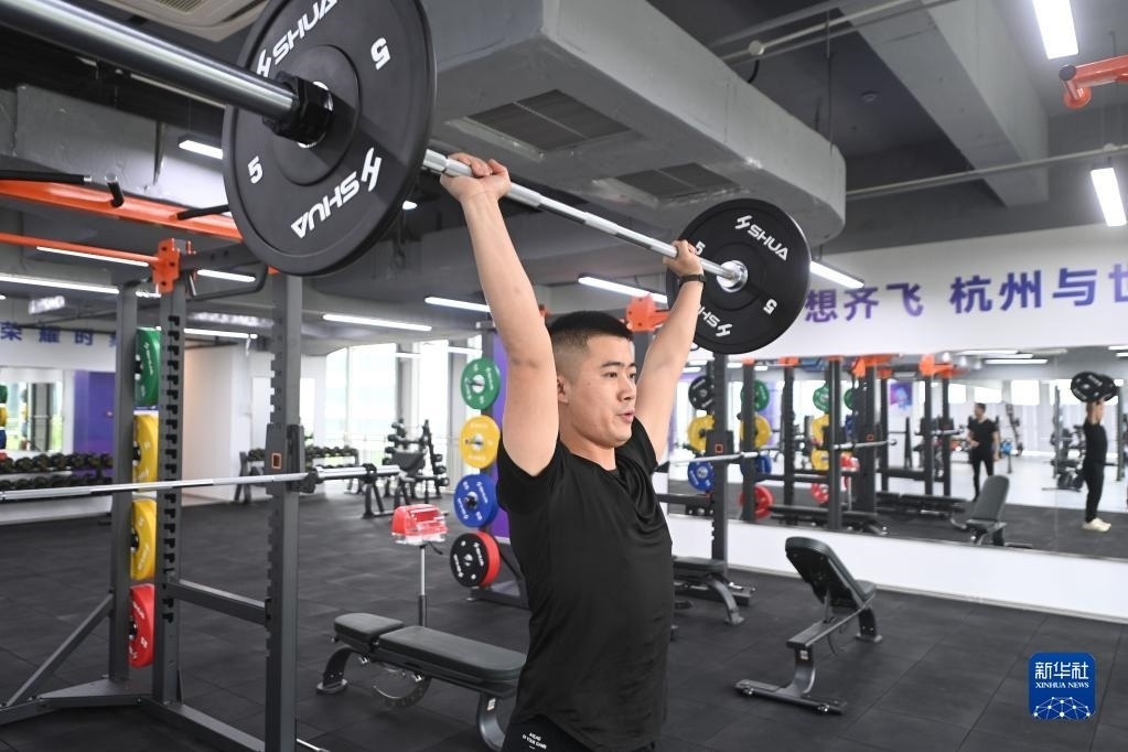6月16日,杭州亞運村健身中心健身教練在綜合器械區(qū)展示。據(jù)了解,健身中心集合了營養(yǎng)管理、體能康復、疲勞恢復、運動心理等各領(lǐng)域的專業(yè)教練,將根據(jù)運動員實際情況,為運動員提供賽事服務(wù)保障。