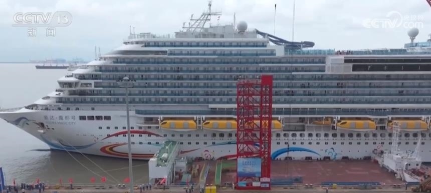 總臺央視記者 吳天白:這里就是郵輪的5甲板,我們可以看到首艘國產大型郵輪正在緩緩地駛向上海外高橋造船碼頭,準備靠泊。這次試航一共進行了振動噪聲、安全返港等90余項海試項目的測試、檢驗,試航圓滿成功,這也意味著“愛達·魔都號”郵輪的各項性能已基本具備運營條件。