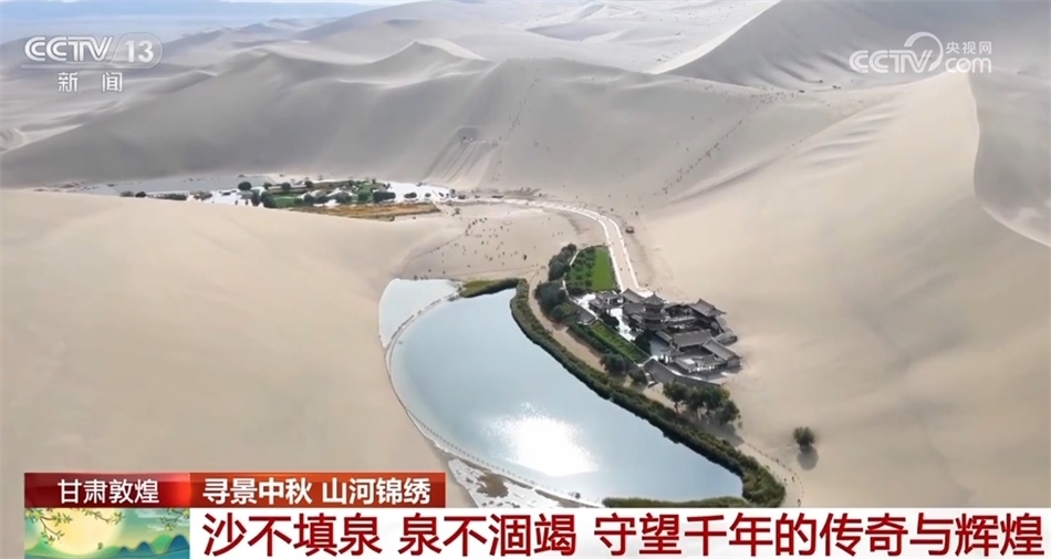 風(fēng)卷飛沙,月牙泉水卻始終碧波蕩漾,這里是甘肅敦煌。沙不填泉,泉不涸竭,鳴沙山與月牙泉就這樣守望千年,也吸引著世界各地的人們前來領(lǐng)略瀚海風(fēng)光。今年中秋和國慶假期,景區(qū)游客數(shù)量預(yù)計突破20萬人次。古道駝鈴,沙漠綠洲,風(fēng)聲、水聲伴著沙丘移動的聲音,千百年來,大自然一直在用最恢弘的方式訴說著一個天地之間的傳奇與輝煌。