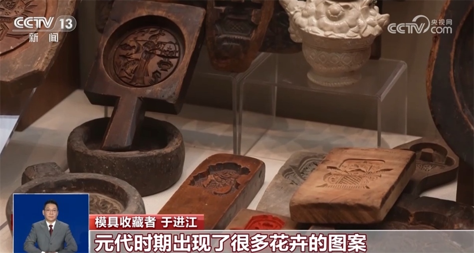 模具收藏者 于進江:從宋代開始,我們會發(fā)現(xiàn)模具里面就出現(xiàn)了玉兔搗藥的造型;元代時期出現(xiàn)了很多花卉的圖案;到了明代時期,加入了很多題材,有期盼中秋節(jié)蟾宮折桂的,有祝壽團圓的;清代時期,(出現(xiàn)了)很多故事圖案月餅。