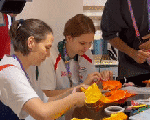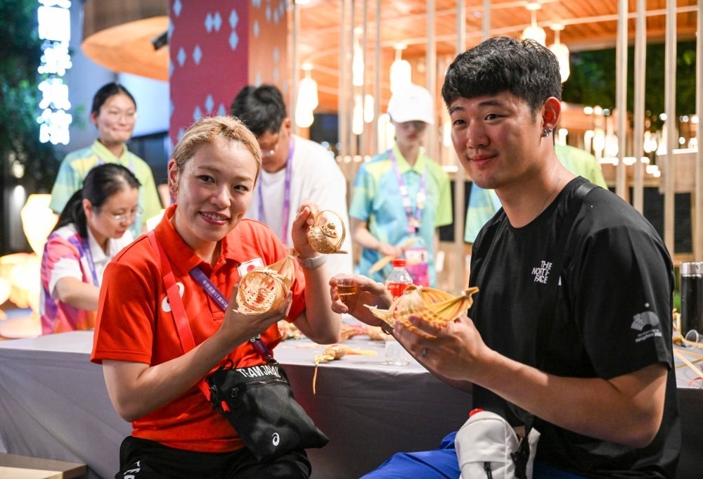 9月25日,一名日本運(yùn)動員(右)在淳安賽區(qū)傳統(tǒng)工藝體驗(yàn)坊和志愿者合影。