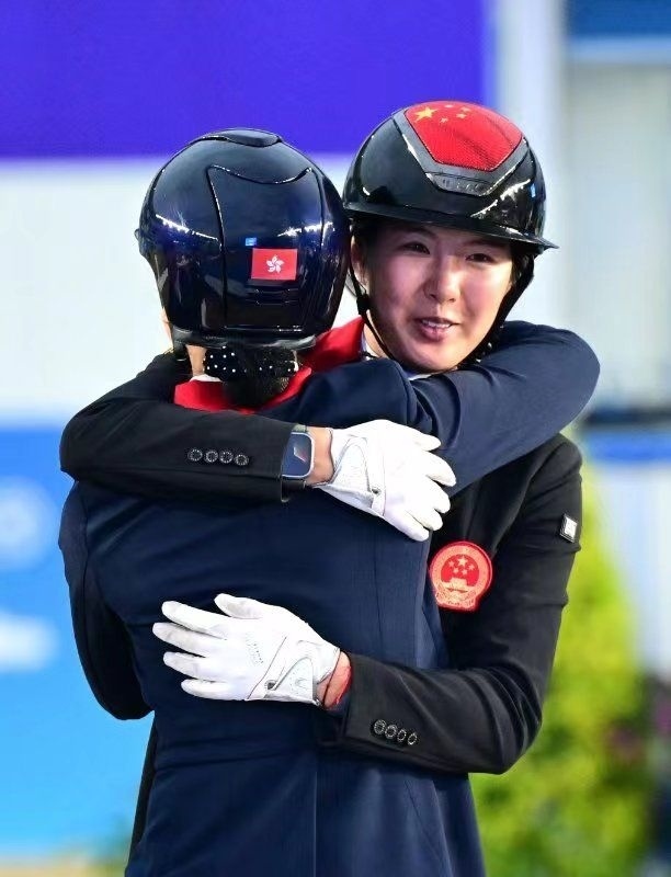 在桐廬馬術(shù)中心進(jìn)行的杭州亞運(yùn)會馬術(shù)比賽盛裝舞步團(tuán)體賽頒獎儀式上,獲得亞軍的中國隊(duì)隊(duì)員饒嘉怡(右)與獲得季軍的中國香港隊(duì)隊(duì)員蕭穎瑩相互擁抱祝福(9月26日攝)
