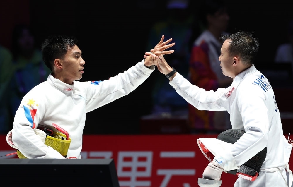 ?9月26日,中國選手王子杰(右)在男子個(gè)人重劍八分之一決賽賽后與菲律賓選手諾埃利托·何塞致意。