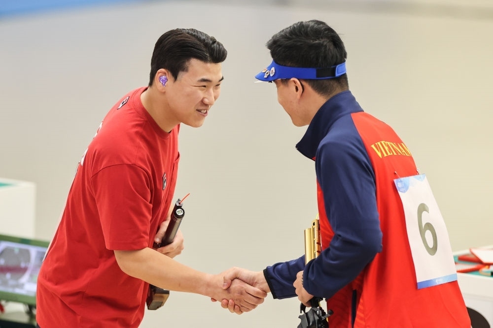 9月28日,韓國選手李元昊(左)與越南選手范光輝在男子10米氣手槍個(gè)人決賽后握手致意。??