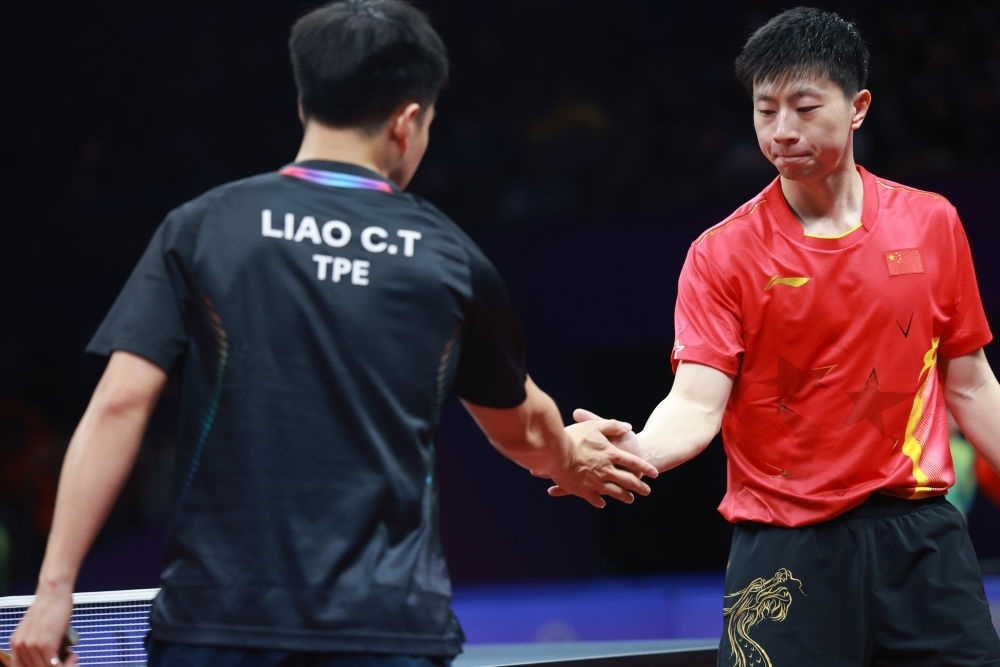 9月25日,中國隊(duì)選手馬龍(右)在乒乓球男子團(tuán)體半決賽后與中國臺北隊(duì)選手廖振珽握手致意。