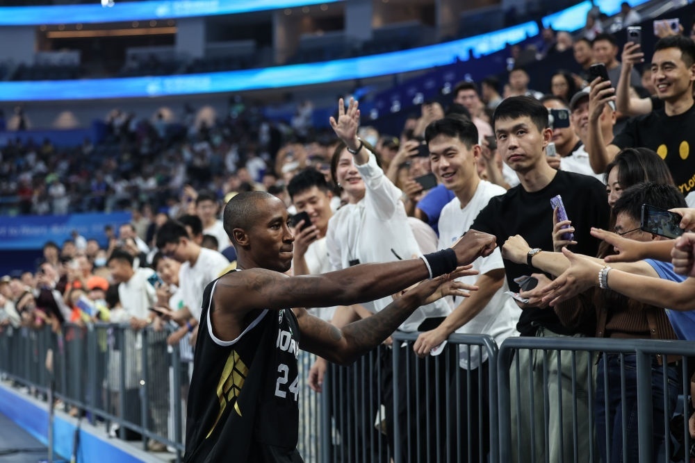 9月28日,約旦隊(duì)球員倫達(dá)·杰斐遜籃球男子預(yù)賽C組后與觀眾互動。