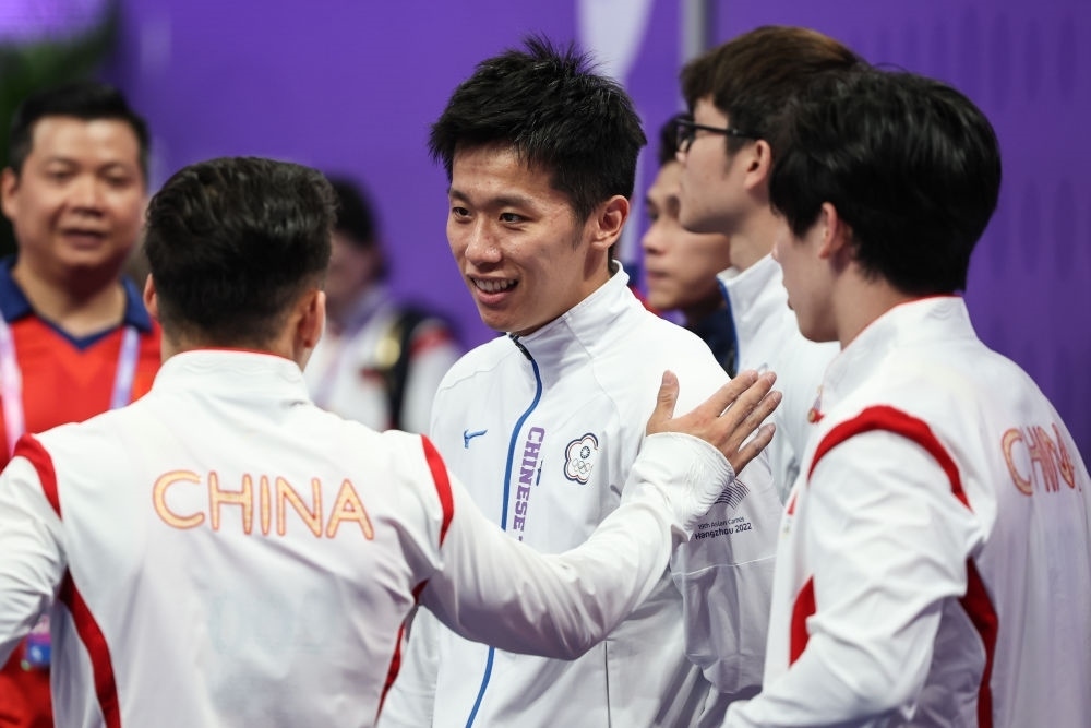 9月28日,中國臺北選手李智凱(中)和中國隊(duì)選手在體操鞍馬決賽中互致問候。