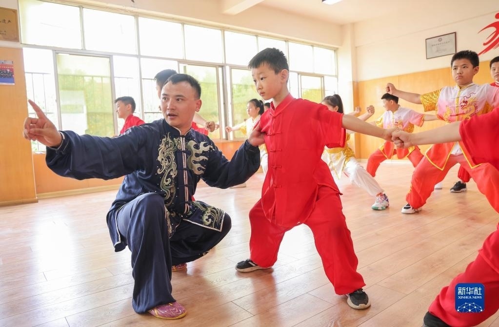 7月8日,在山東省臨沂市蘭山區(qū)一家武術(shù)館,武術(shù)老師指導(dǎo)學(xué)員練習(xí)拳法動作。