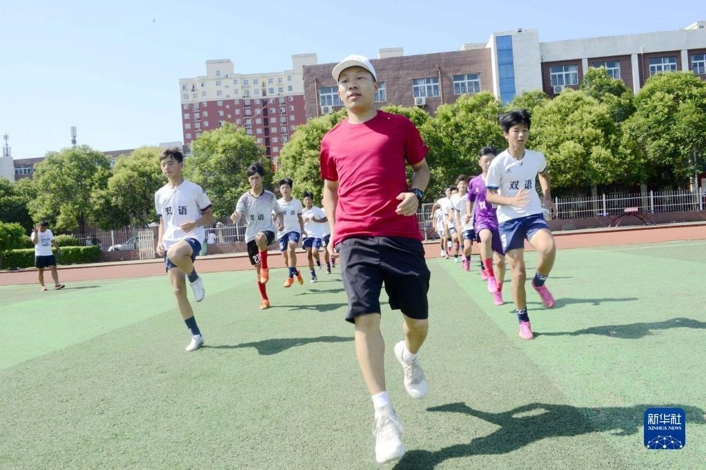 7月7日,在河南省焦作市武陟縣一家體育培訓(xùn)機構(gòu),教練指導(dǎo)學(xué)生練習(xí)跑步。