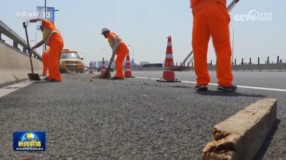 這兩天,北京持續(xù)高溫。在廣渠快速路上,道路養(yǎng)護(hù)工人正頂著烈日清理過往車輛遺撒的沙石。由于地面溫度高,這些沙石極容易引起車輛爆胎。